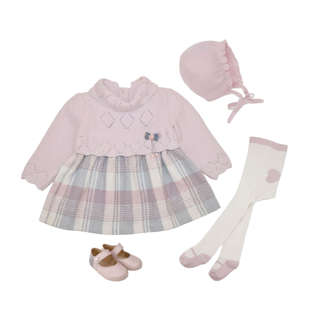 طقم ميني جنتل فستان بناتي - تريكو وجوخ - 4 قطع - وردي ورمادي