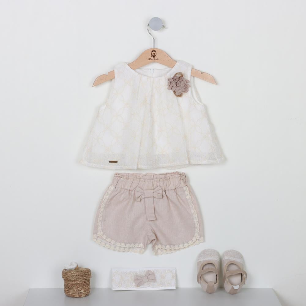 - الألوان: بلوزة بيضاء بزينة وردية مع شورت بيج فاتح وتفاصيل دانتيل