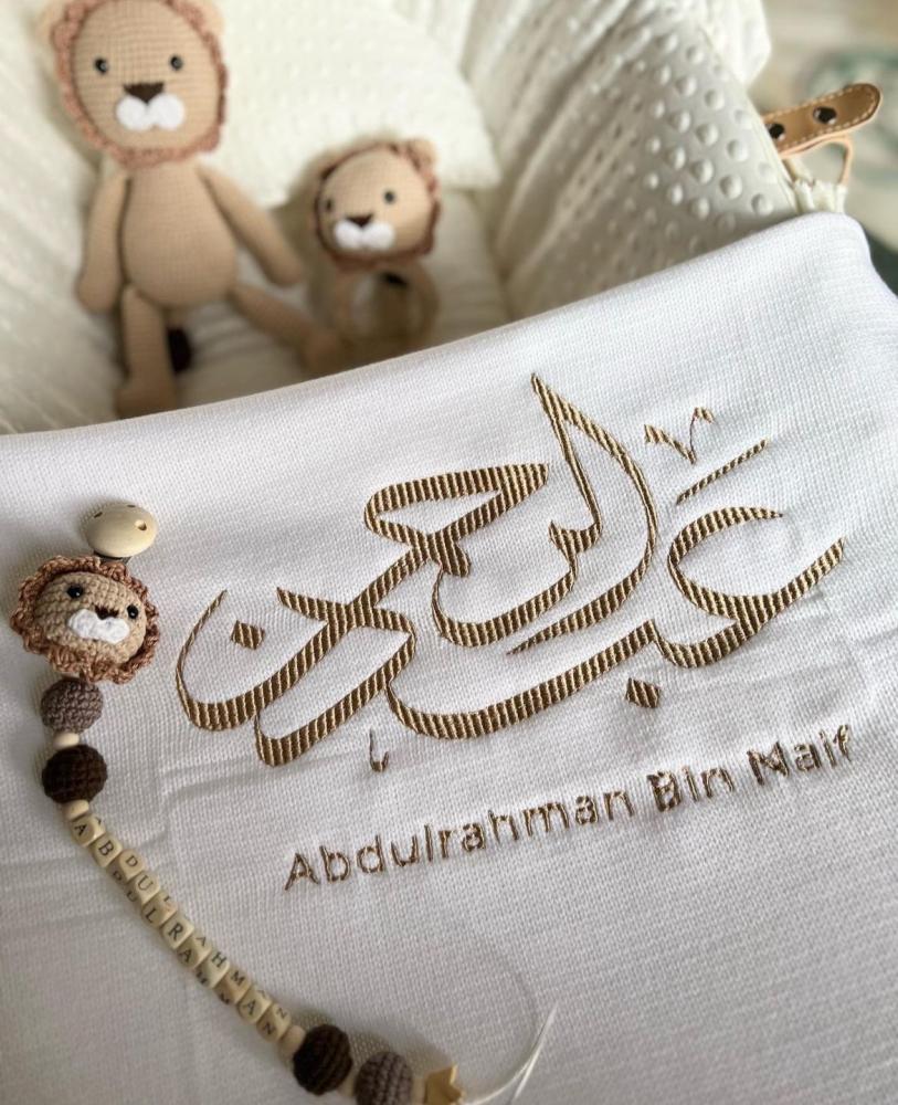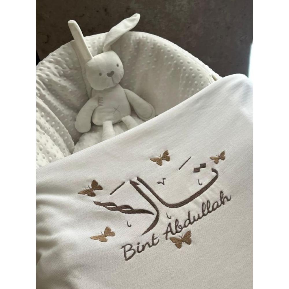 يتم تطريز الاسم على القماش بأعلى معايير الجودة لضمان راحة وسلامة صغيرك. اكتشف تشكيلتنا الواسعة اليوم واختر البطانية المثالية لمولودك الجديد!