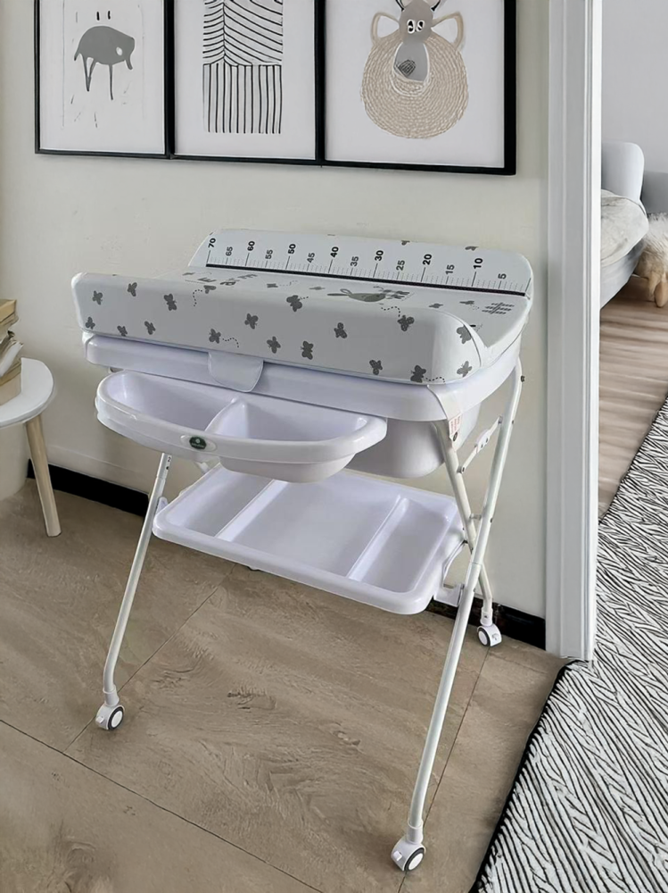 • 🔒 تصميم ثابت وآمن: حواف مرتفعة لحماية الطفل أثناء التغيير + قاعدة معدنية قوية وعجلات بقفل.