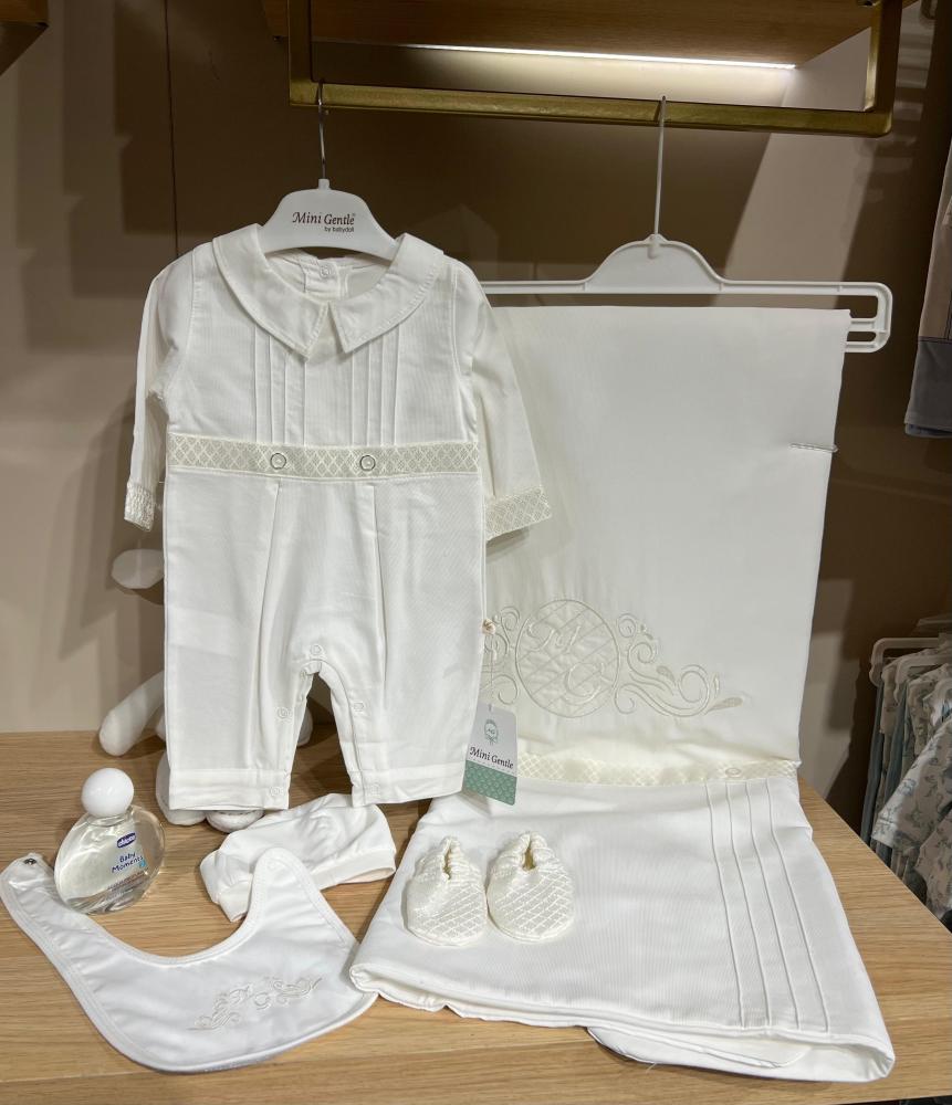 طقم مواليد ولادي مكون من خمس قطع أنيقة ومتكاملة. يحتوي على أفرول مريح، بطانية ناعمة، طاقية صغيرة، حذاء للمواليد، وصدارية لحماية الملابس.